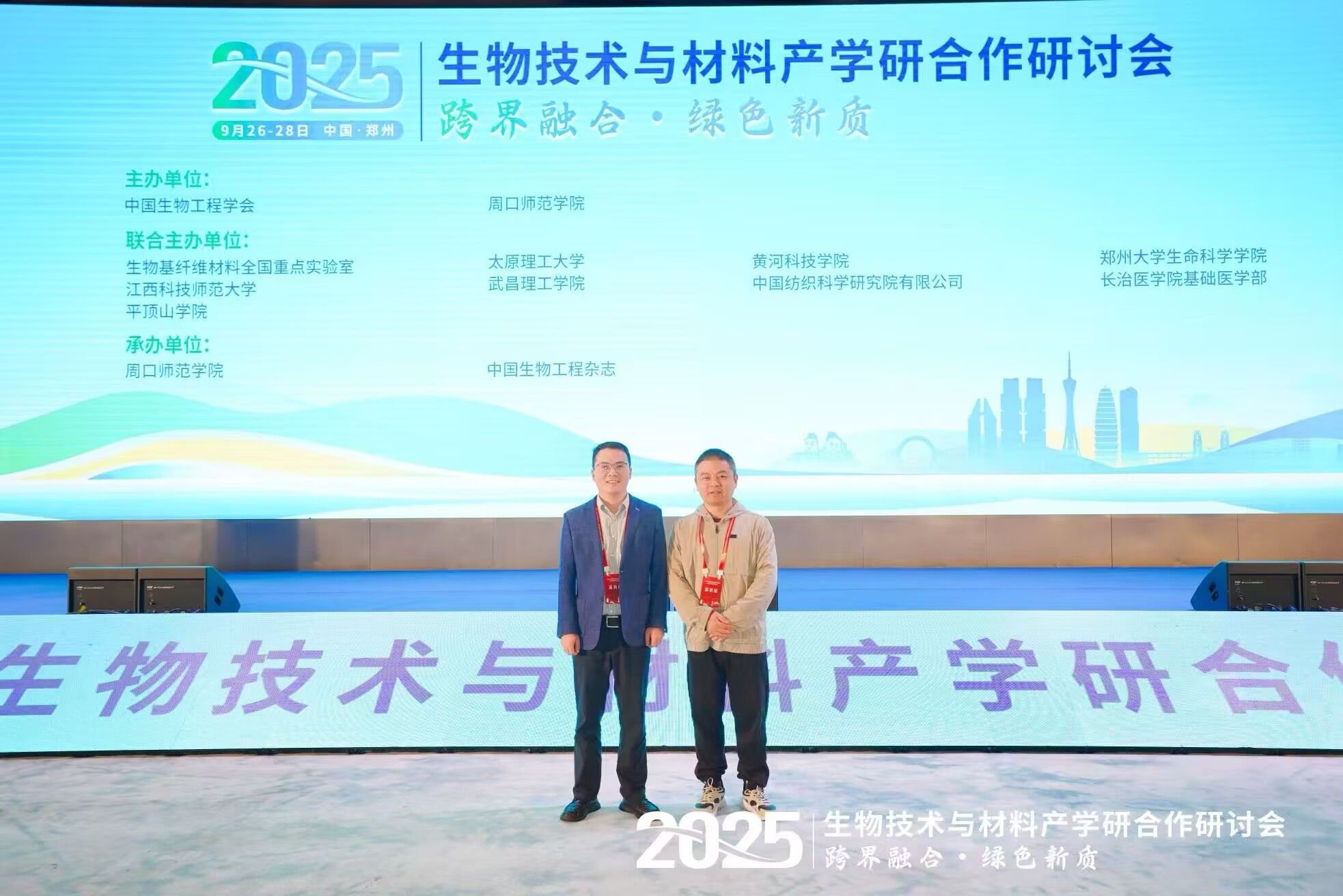 为积极响应国家“十四五”科技创新规划,推动生物技术与材料领域的深度融合与协同创新,9月26日至28日,由yl7703永利集团、中国生物工程学会等单位联合主办的2025全国生物技术与材料产学研合作研讨会在郑州隆重召开。作为联合主办单位之一,我院高度重视此次学术盛会,派出副院长王小华副教授与生物工程系系主任熊开斌副教授全程参与会议,与来自全国各地的院士专家、学者及产业界代表共同探讨学科前沿与发展路径。